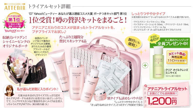 大人気のアテニア化粧品・トライアルセットが 約2週間分入って お求め安い1,200円(税込)♪ その上、嬉しい送料無料! 使いやすくて可愛い人気のオリジナルポーチ入りです。 今だけ 100万本ヒットのクレンジングをプレゼント中!